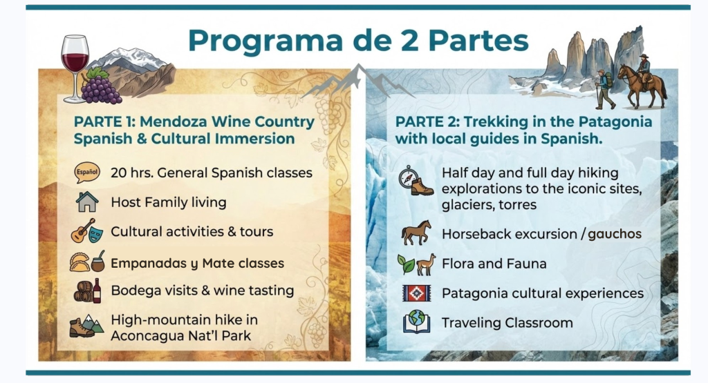 There are not many English Speakers in Mendoza, Argentina and as per our other programs, the goal is Spanish Immersion through host families, Spanish classes, local guides and explorations. While we will find more English tourists in Patagonia, the goal is still Spanish. Rory and I are committed to doing our part to keep the group commitment of speaking Spanish AND all our guides and explorations will be with local guides speaking Spanish.